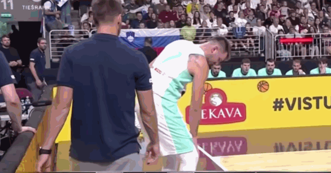 那是在一次防守回合中,队友格雷戈尔-赫罗瓦特压到了东契奇的膝盖。东契奇一瘸一拐地离开赛场,显然是受了伤。受伤后,东契奇回到了斯洛文尼亚队的替补席,继续观看这场比赛。