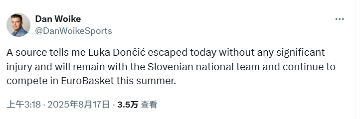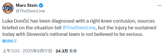 尽管东契奇有过一些伤病史,尤其是腿部伤病,但多篇报道显示他的这次受伤并不严重。名记马克-斯坦因报道称,东契奇右膝挫伤。名记沃伊克表示,他仍将留在斯洛文尼亚国家队,参加欧锦赛。